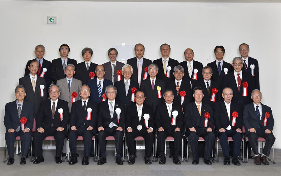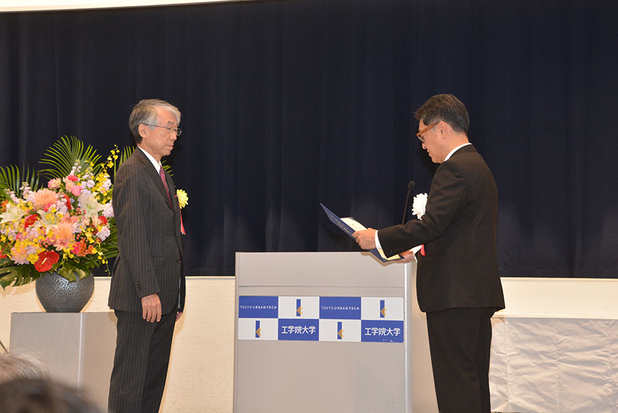 初めに理事長から挨拶があり、賛助員の称号贈呈や学園表彰・大学表彰などが行われました。これらは、学園の教育・研究や業務において多大な貢献をされた方に対し、その功績を称えるものです。