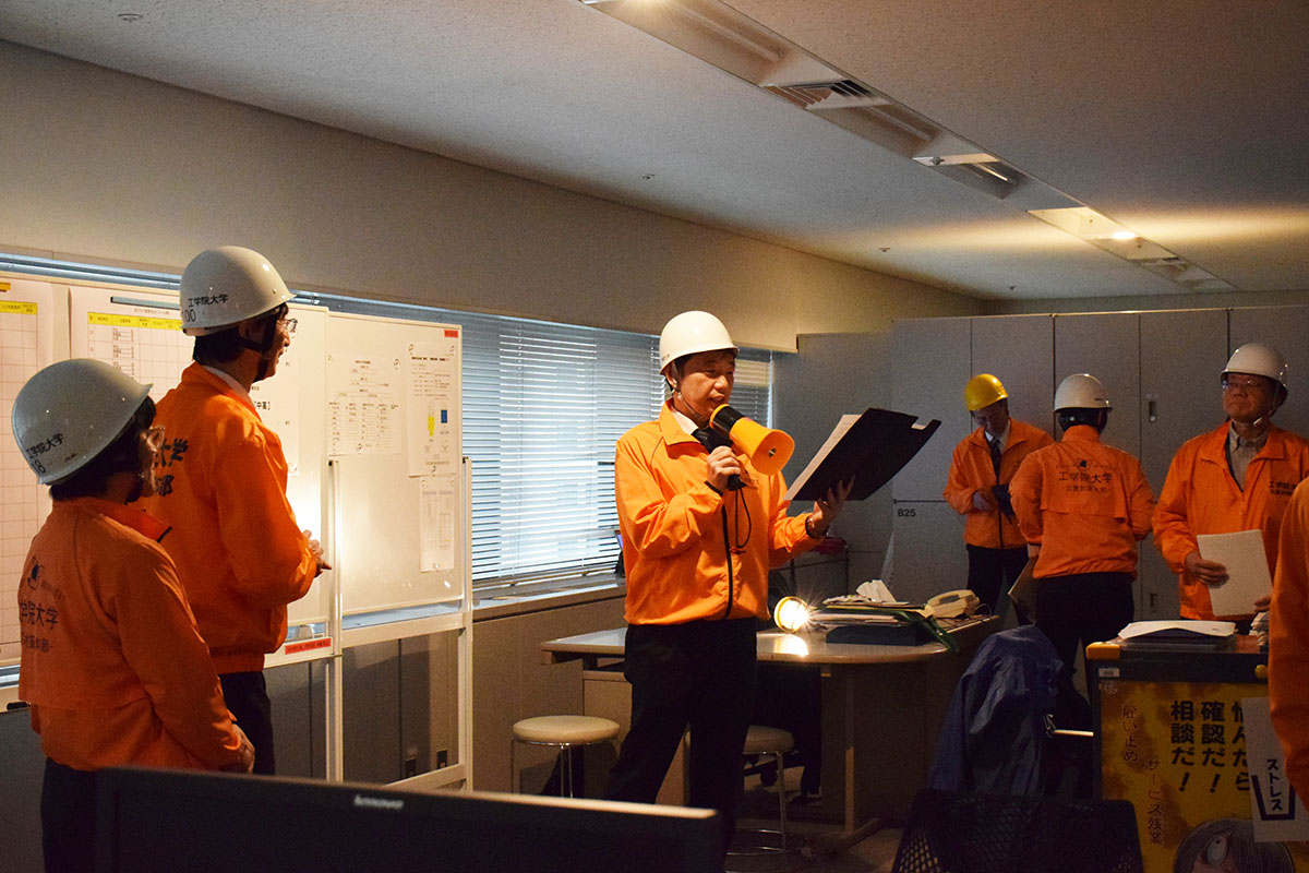 自衛消防訓練では、実践的な訓練とすることを目的に、教職員ともに訓練詳細を事前に知らない状態で行いました。地震が起きたことを知らせる館内放送が流れると、机の下に移動するなどの身を守る行動を各自がとりました。その後は各校舎に災害対策本部を設置し、教員や各部署長の指示で、各フロアの人数確認や受傷者の対応などを行いました。全校舎の情報を集約し、安全が確認できたところで、自衛消防訓練は終了しました。