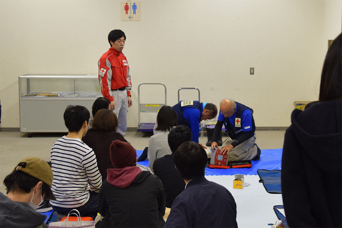 八王子キャンパスでも、東京消防庁八王子消防署の協力を得て、AED利用訓練・水消火器訓練が行われました。また、八王子市生活安全部防災課に協力いただき、起震車で最大震度7の揺れを体験するコーナーにも多くの学生が訪れました。さらに、TKK3大学連携の取組として、神戸学院大学と東北福祉大学の学生たちによる、エコノミークラス症候群を予防する「さんあい体操」や車椅子を使った搬送、様々な場で活用できるロープワークも行われました。