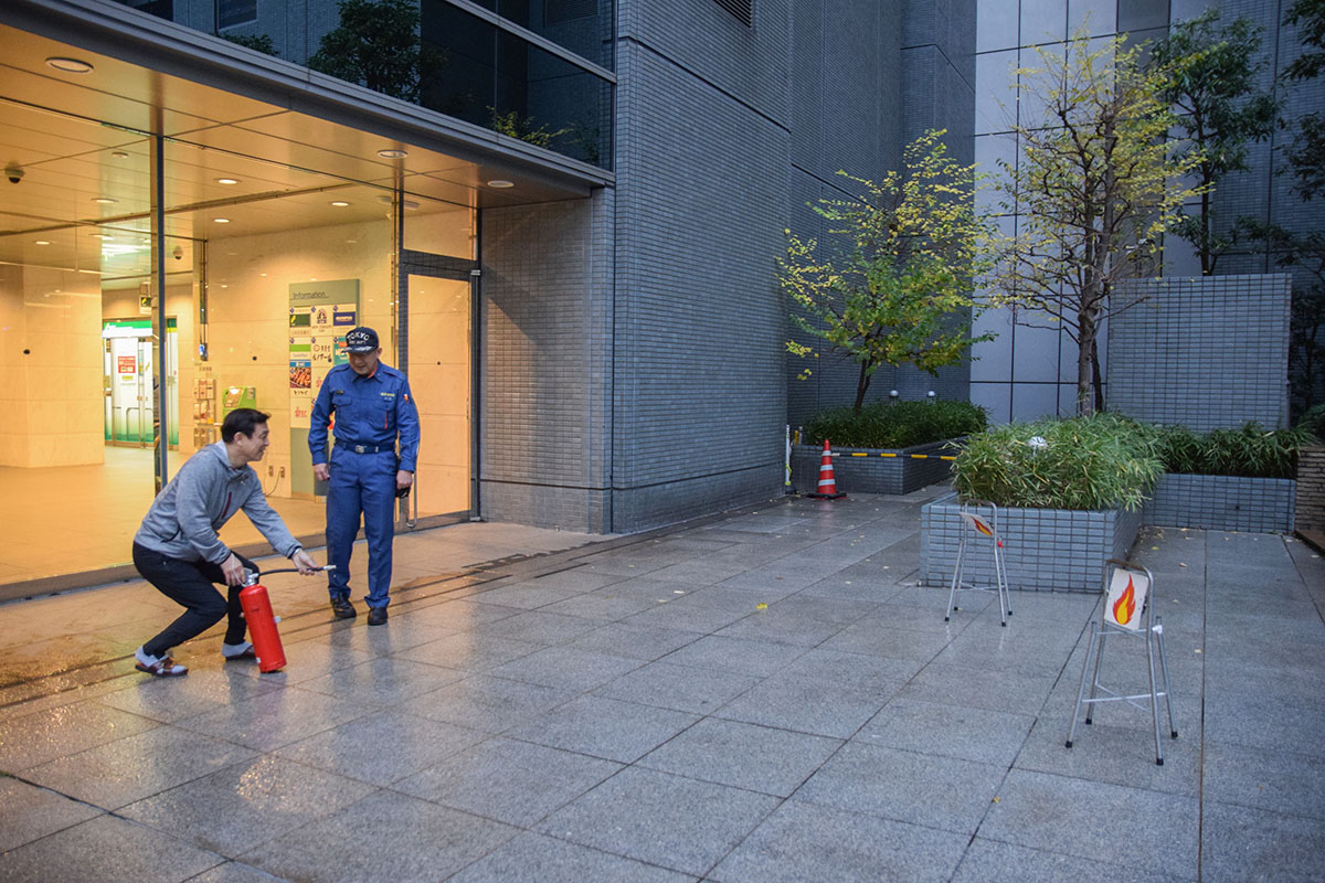 続いての体験型訓練では、新宿キャンパスでは、AED利用・身近な物を使った応急救護の講習、水消火器を使った消火訓練が行われました。初めての体験ばかりで戸惑う様子もありましたが、参加者は「緊急時に対応できる知識を身につけるいい機会になった」と話していました。