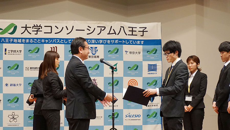 最終日には、「八王子市長へ直接提案!~最終選考会~」を開催。工学院大学からは、経営情報システム研究室(指導教授:三木良雄教授)に所属するシステム数理学科4年・西野遼祐さんが発表し、奨励賞を受賞しました。最終選考会には、多くの応募の中から事前審査で選出された8団体が参加しました。