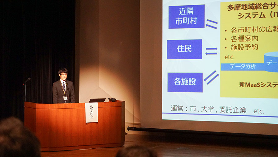 西野さんは、「Hachioji City as a Serviceの提言」をテーマに、ビックデータ分析に基づき高齢化が進む八王子市に適した新しい公共交通サービスを提案しました。市長や審査員の方々からは、「夢がある素晴らしい提案」と高い評価を受けましたが、「内容をより深め、費用感などについても言及してほしい」とさらなる研究に向けてのアドバイスもいただきました。