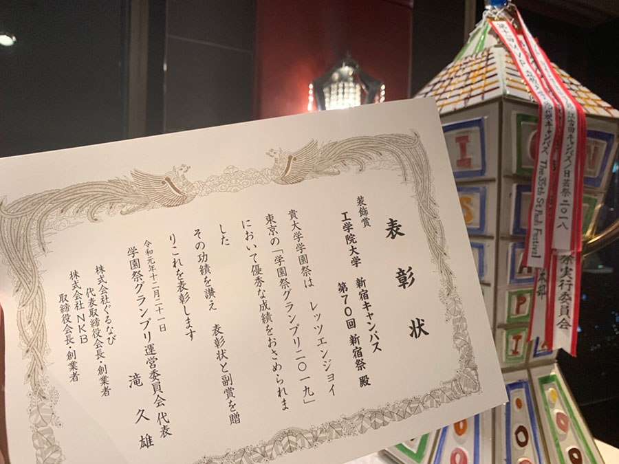 この度、「学園祭グランプリ2019」で、工学院大学第70回新宿祭(11/22~24開催、主催:学園祭実行委員会)が、「装飾賞」を受賞しました。