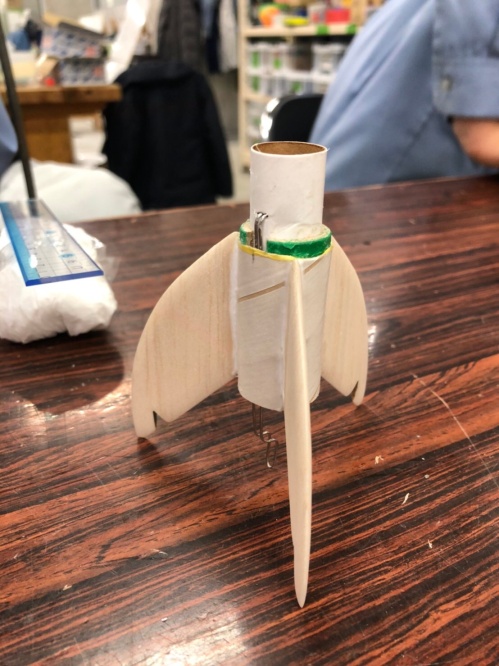 1/29(水)、今まで作った各部品の接着を行い、モデルロケットの形ができあがってきました。