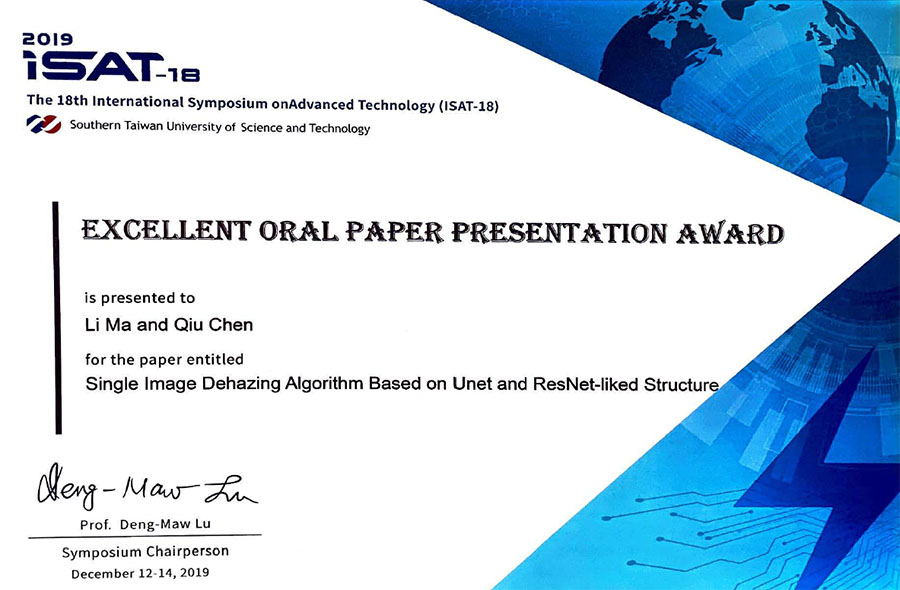 2019年12月13日に「Southern Taiwan University of Science and Technology(南台科技大学)」で開催された「18th International Symposium on Advanced technology (ISAT-18)」において、大学院電気・電子工学専攻修士2年の馬力さん(画像情報メディア研究室・陣キュウ教授)が、研究題目「Adversarial Knowledge Distillation Algorithm for a Compact Generator」の研究発表で「Excellent Oral Paper Presentation Award」を受賞しました。