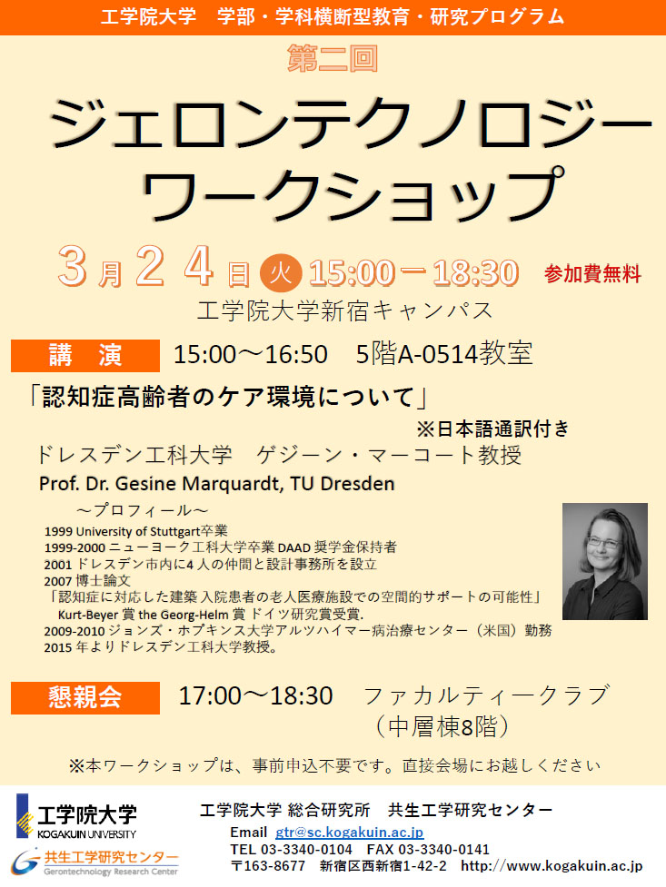 「認知症高齢者のケア環境」というテーマで、ジェロンテクノロジーのワークショップを開催します。ドレスデン工科大学より、認知症患者の住環境研究、バリアフリーがご専門であるゲジーン・マーコート教授をお招きし講演いただく予定です。病院や福祉施設等の建築やデザインにご興味のある方は、ぜひご参加ください。入場無料です。