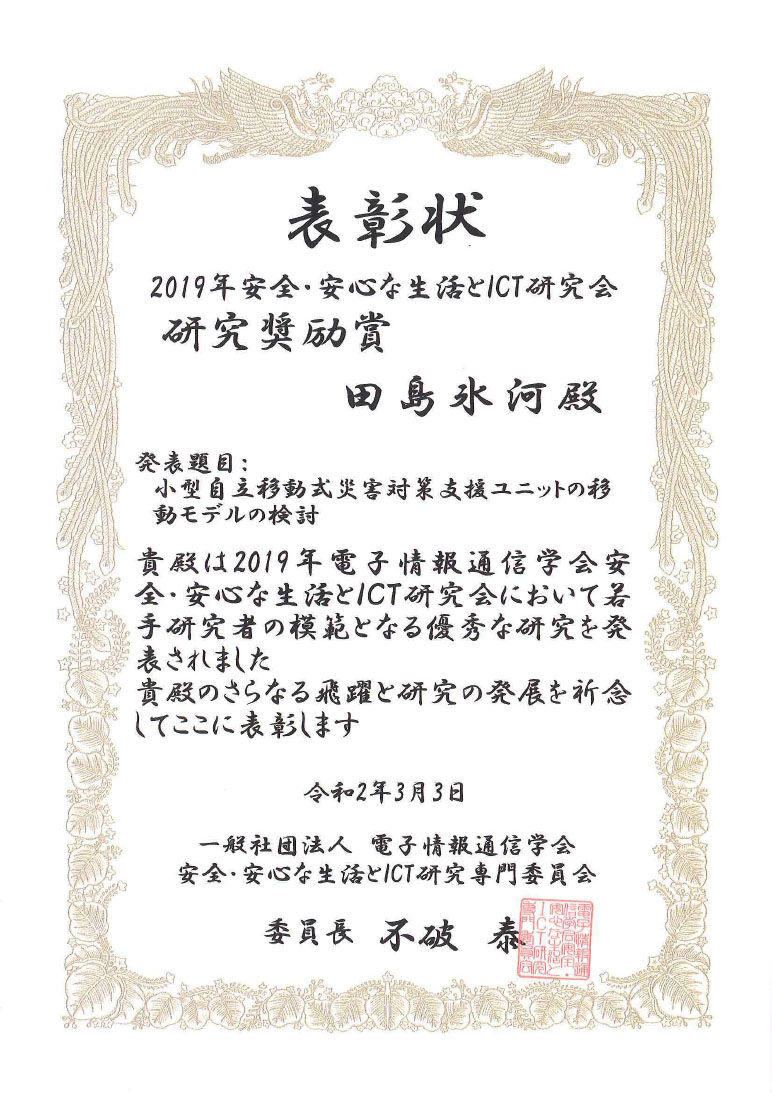 この賞は、電子情報通信学会 安全・安心な生活とICT研究専門委員会が主催、共催、または併催する研究会および大会において発行される技術研究報告または講義論文集に掲載された論文の内、その後の研究の発展に大きな期待を持つことができる論文の筆頭著者である学生または若手研究者を表彰するものです。田島氷河さんが発表された研究は、複数の小型自立移動式災害対策支援ユニット(D-ZEV mini)が新宿内の一次滞在施設を巡回するモデルを作り、災害情報データの到達率をシミュレーションにより評価したものです。なお、この研究は、本学が推進している私立大学研究ブランディング事業「エリア防災」の一環として進めているものです。
