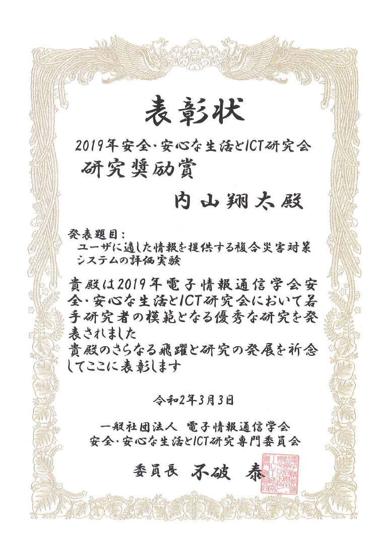この賞は、電子情報通信学会 安全・安心な生活とICT研究専門委員会が主催、共催、または併催する研究会および大会において発行される技術研究報告または講義論文集に掲載された論文の内、その後の研究の発展に大きな期待を持つことができる論文の筆頭著者である学生または若手研究者を表彰するものです。内山翔太さんが発表された論文では、地震発生時に西新宿地区の防災担当者や一般の人に向けて災害情報を伝えるシステムについて、防災訓練で使用しその有効性を確認しました。なお、この研究は、本学が推進している私立大学研究ブランディング事業「エリア防災」の一環として進めているものです。