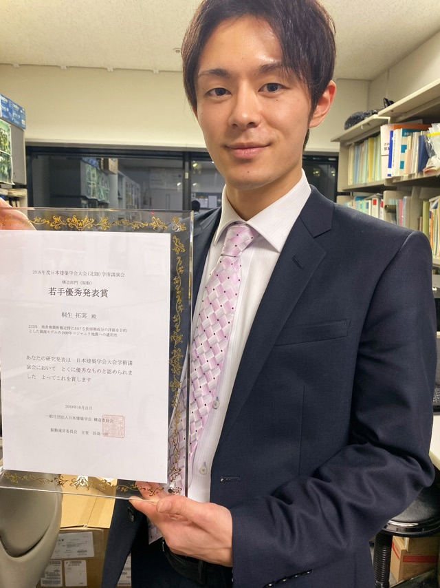 2019年9月3日~6日に金沢工業大学で開催された2019年度日本建築学会大会(北陸)において、建築学専攻修士1年の桐生拓実さん(久田研究室・久田嘉章教授)が、研究題目「地表地震断層近傍における長周期成分の評価を目的とした震源モデルの1999年コジャエリ地震への適用性」の研究発表で構造部門(振動)若手優秀発表賞を受賞しました。