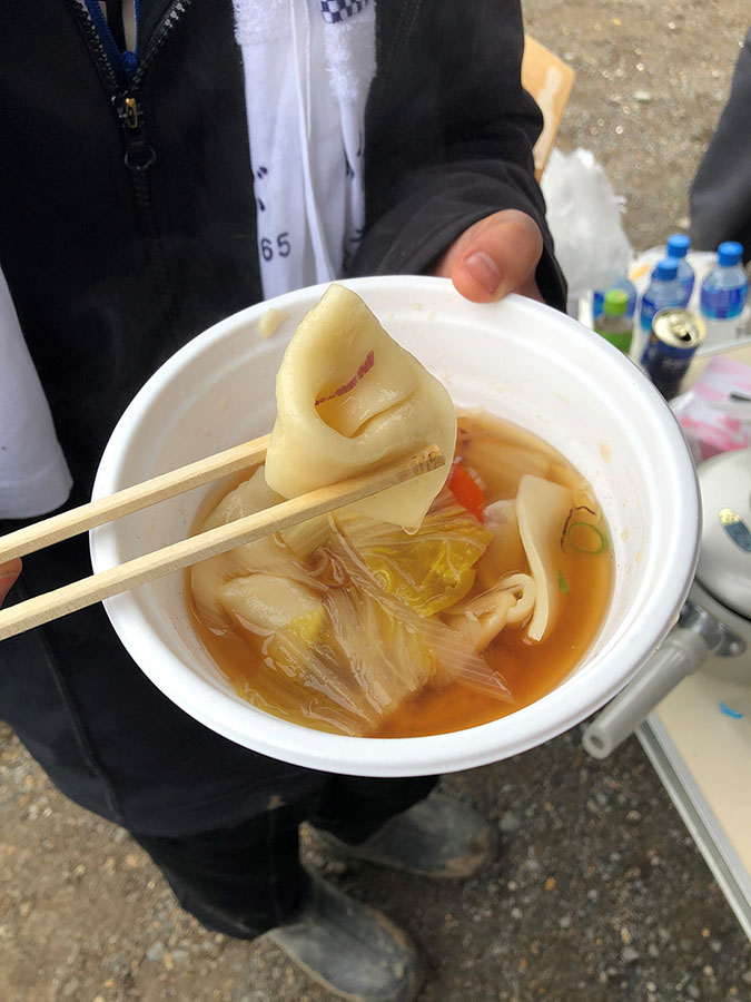 当日のお昼ご飯には地域の方々から郷土料理の「耳うどん」、「くろからあげ」などをいただき、地域住民の方々との交流もありました。