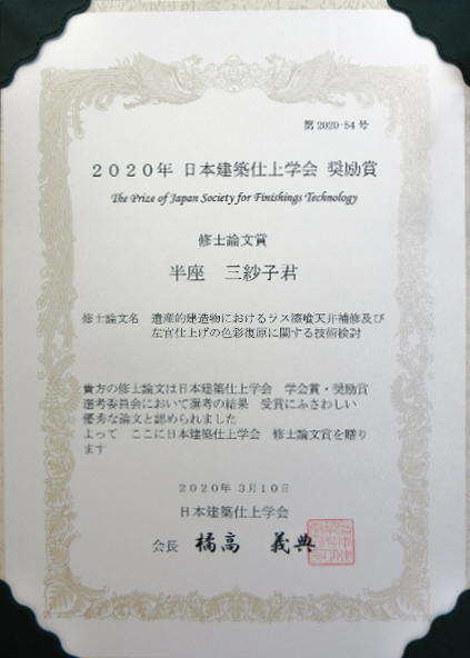 建築学専攻修士2年の半座三紗子さん(田村研究室・田村雅紀教授)の修士論文「遺産的建造物におけるラス漆喰天井補修及び左官仕上げの色彩復原に関する技術検討」に対し、日本建築仕上学会より2020年日本建築仕上学会奨励賞「修士論文賞」が贈られました。
