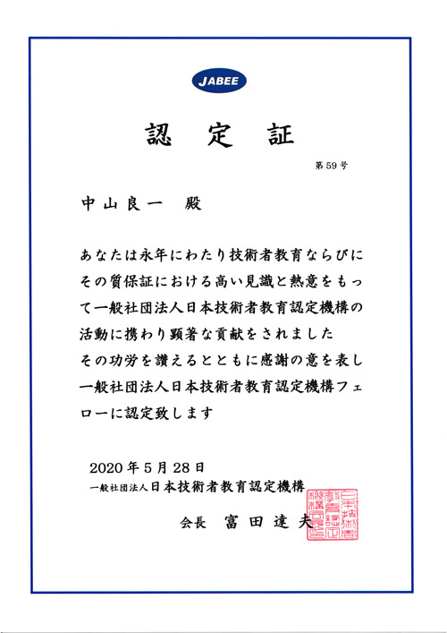 この称号は、永年にわたり、技術者教育ならびにその質保証における高い見識と熱意を持って、同機構の活動に携わり、顕著な貢献をされた方に贈られます。