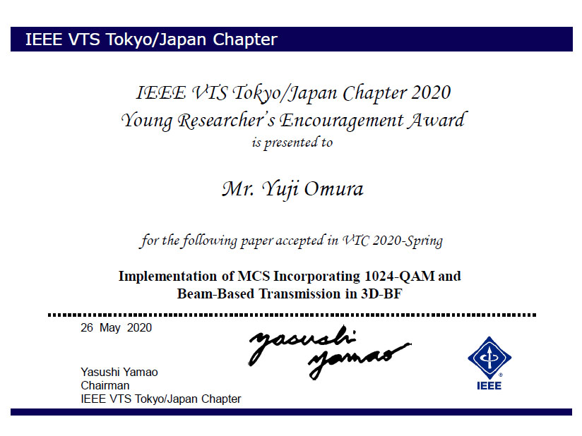 電気・電子工学専攻修士1年の大村有司さん(ワイヤレスコミュニケーション研究室・大塚裕幸教授)の論文「Implementation of MCS Incorporating 1024-QAM and Beam-Based Transmission in 3D-BF」が「IEEE VTC2020-Spring」に採録され、IEEE VTS Tokyo/Japan Chapterの選考委員会において今後の活躍が期待できると認められ、「IEEE VTS Tokyo/Japan Chapter 2020 Young Researcher's Encouragement Award(奨励賞)」を受賞しました。