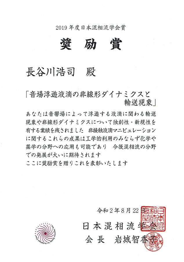 Home 2020年度のお知らせ 長谷川浩司准教授(機械工学科)が日本混相流学会 奨励賞を受賞 長谷川浩司准教授(機械工学科)が日本混相流学会 奨励賞を受賞 2020/08/24 シェアする 長谷川浩司准教授(機械工学科)が2019年度日本混相流学会 奨励賞を受賞し、8/22(土)開催の混相流シンポジウム2020 表彰式(オンライン)で授与されました。奨励賞は、際立った独創性、新規性、将来性などが期待される40歳以下の日本混相流学会会員に贈られる賞で、長谷川准教授が音響場で浮遊する液滴の非線形ダイナミクスや輸送現象の解明に貢献したことが評価されました。 日本混相流学会 混相流工学研究室 機械工学科 工学部 工学部の活動・実績 前へ 一覧に戻る 次へ