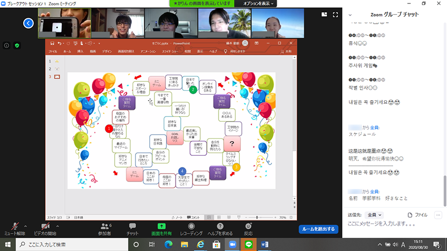 学科連合委員会の主催で、8月30日(日)に留学生のための交流イベント「KO-RYU-GAKUIN」をオンライン上ZOOMで開催しました。このイベントは、留学生および日本人学生の交流を深めるイベントで、留学生13名および日本人学生31名の合計44名が参加をしました。