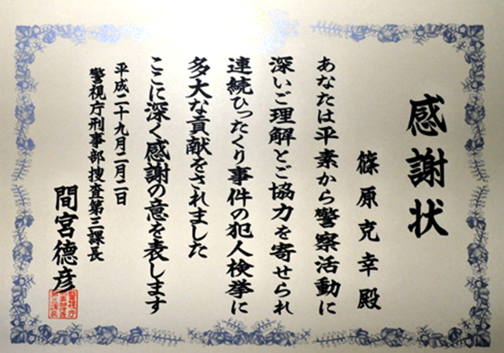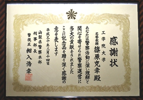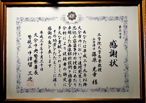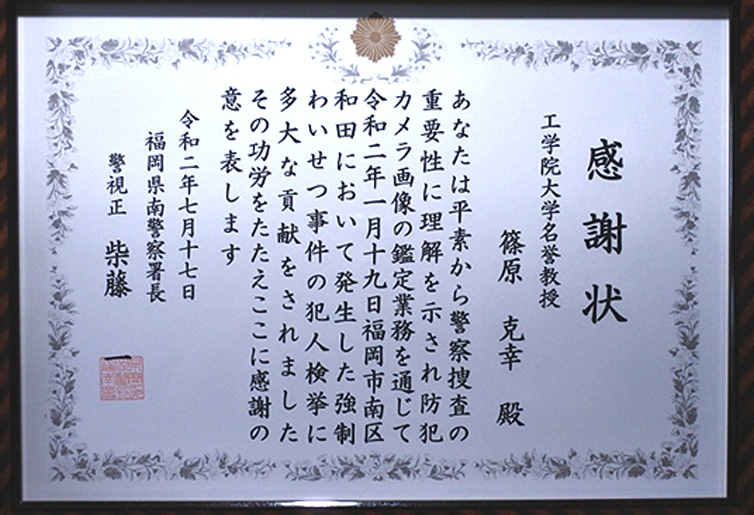 篠原教授は画像工学が専門で、卓越した画像解析技術と綿密な分析作業により犯人逮捕に協力し、警察職務に多大な貢献をしたと評価され、平成29年2月から令和2年7月にかけて数々の感謝状が送られています。