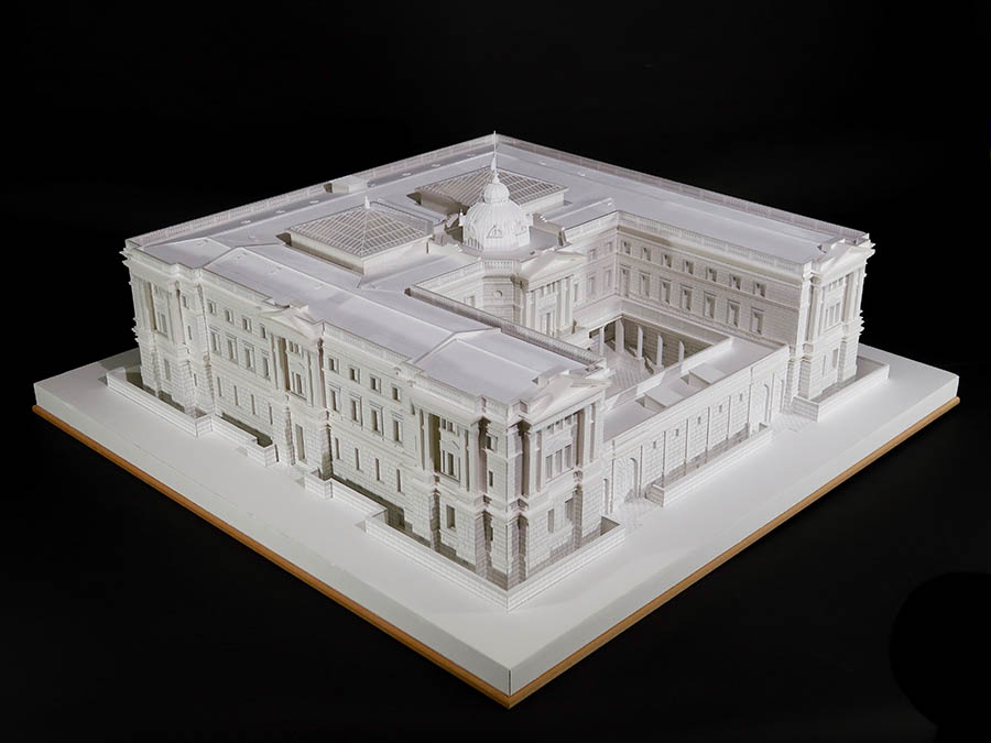 本学の前身である工手学校の設立時に中心的役割を担った辰野金吾が設計を手掛けた日本銀行本店本館の創建時の模型(1/100)で、日本銀行金融研究所貨幣博物館から委託を受け、約20名の学生たちが制作しました。昨年には、日本銀行金融研究所貨幣博物館で開催された辰野金没後100年特別展「辰野金吾と日本銀行—日本近代建築のパイオニア—」(2019 年9月20日(土)~2019年12月8日(日))にも展示されていました。