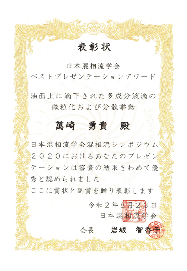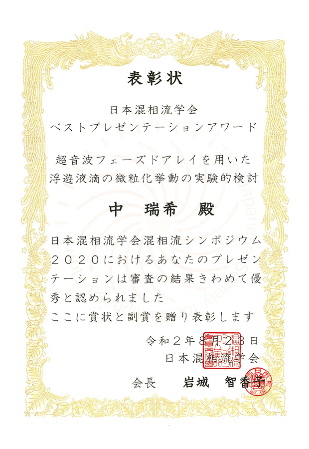 自身の研究題目である「超音波フェーズドアレイを用いた浮遊液滴の微粒化挙動の実験的検討」(中瑞希さん)「油面上に滴下された多成分液滴の微粒化および分散挙動」(萬崎勇貴さん)に関して発表を行い、学会に参加している大学教員や学会実行委員の方々より研究内容が評価され、学生セッションの参加者の中でベストプレゼンテーションアワードに選出・授与されました。