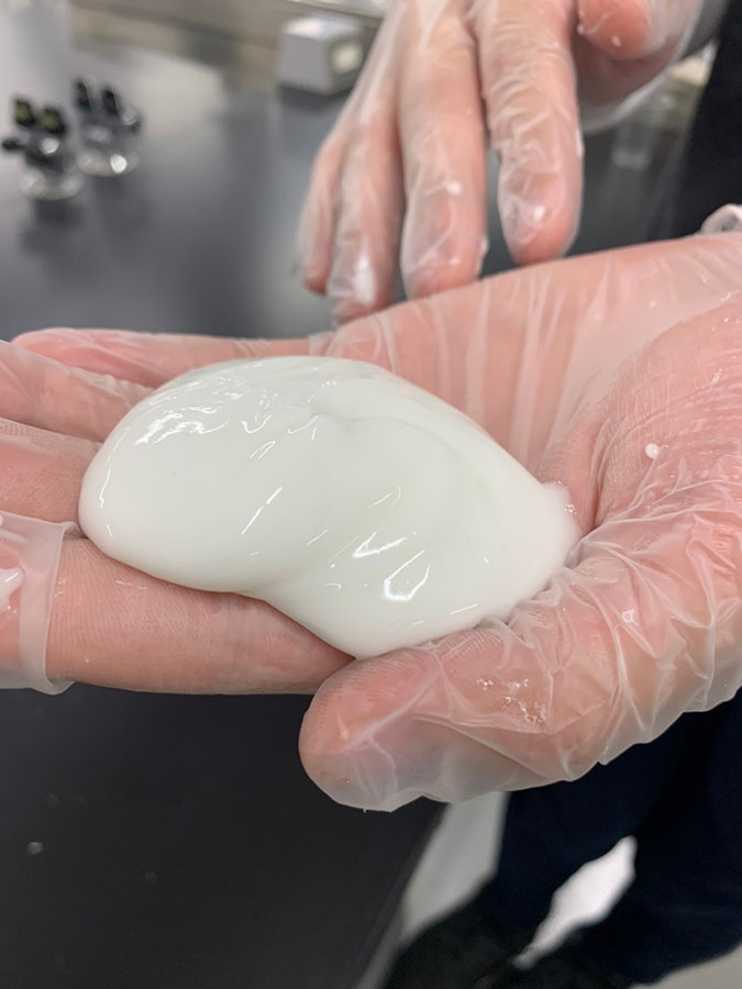 アイスバーグの意味は氷山。アイスバーグスライムとは、指で触ると、バリッと音がして、まるで雪を踏んでいるような音がするスライムです。前回のオンラインでの活動に引き続き、ベビーパウダーの分量を変える比較実験や、シェービングフォームの代用品としてハンドソープを使った実験を行いました。残念ながら、ハンドソープはシェービングフォームの代わりの機能は果たさず、今回の実験ではアイスバーグスライムは上手くできませんでした。