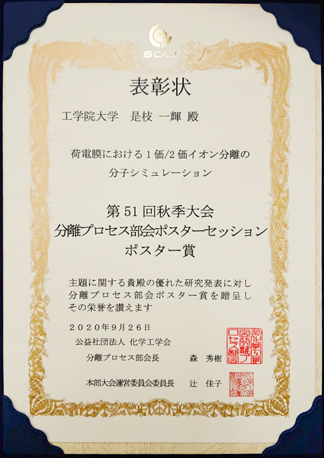 2020年9月26日(土)にオンラインで開催された化学工学会第51回秋季大会の分離プロセス部会ポスターセッションにおいて、化学応用学専攻修士2年の是枝一輝さん(計算化学デザイン工学研究室・高羽洋充教授)がポスター賞を受賞しました。
