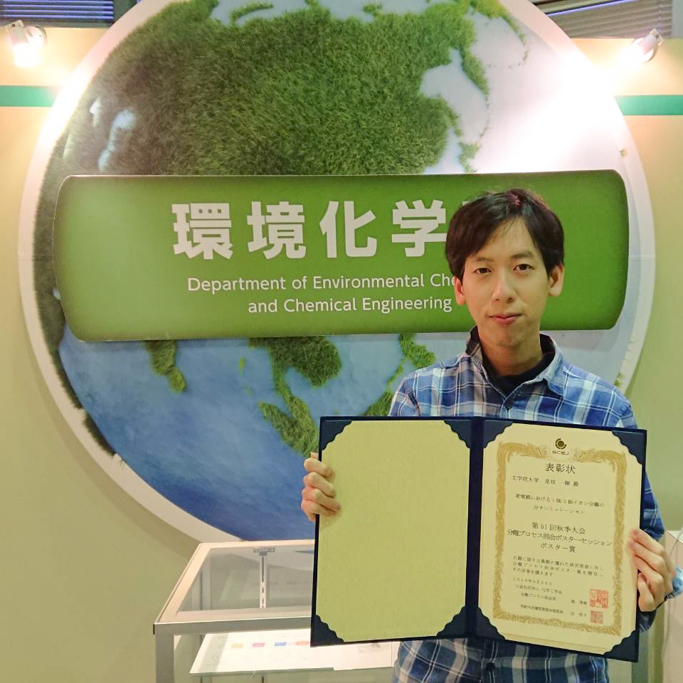 化学工学会第51回秋季大会において、ポスター賞を受賞できて大変嬉しく光栄に思います。ポスター賞を受賞できたのは普段から熱心に指導してくださった高羽先生や宮川先生のおかげです。この場をお借りして、心よりお礼申し上げます。今回の受賞を励みに、今後も研究に一層頑張っていきます。