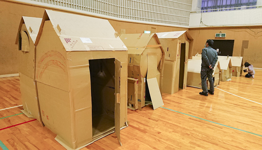 用途に応じて複数タイプのシェルターを組み立て、オリジナルの窓を付けたりマーカーでデコレーションするなど、楽しみながら防災意識を高める助けとなりました。