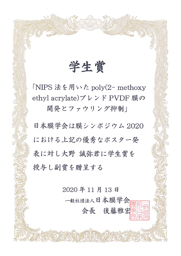 2020年11月12日~13日、オンライン開催となった日本膜学会主催の膜シンポジウム2020において、化学応用学専攻修士1年の大野誠弥さん(エネルギーシステム工学研究室・赤松憲樹教授)が「NIPS法を用いたpoly(2-methoxyethyl acrylate)ブレンドPVDF膜の開発とファウリング抑制」に関する研究発表を行い、「学生賞」を受賞しました。