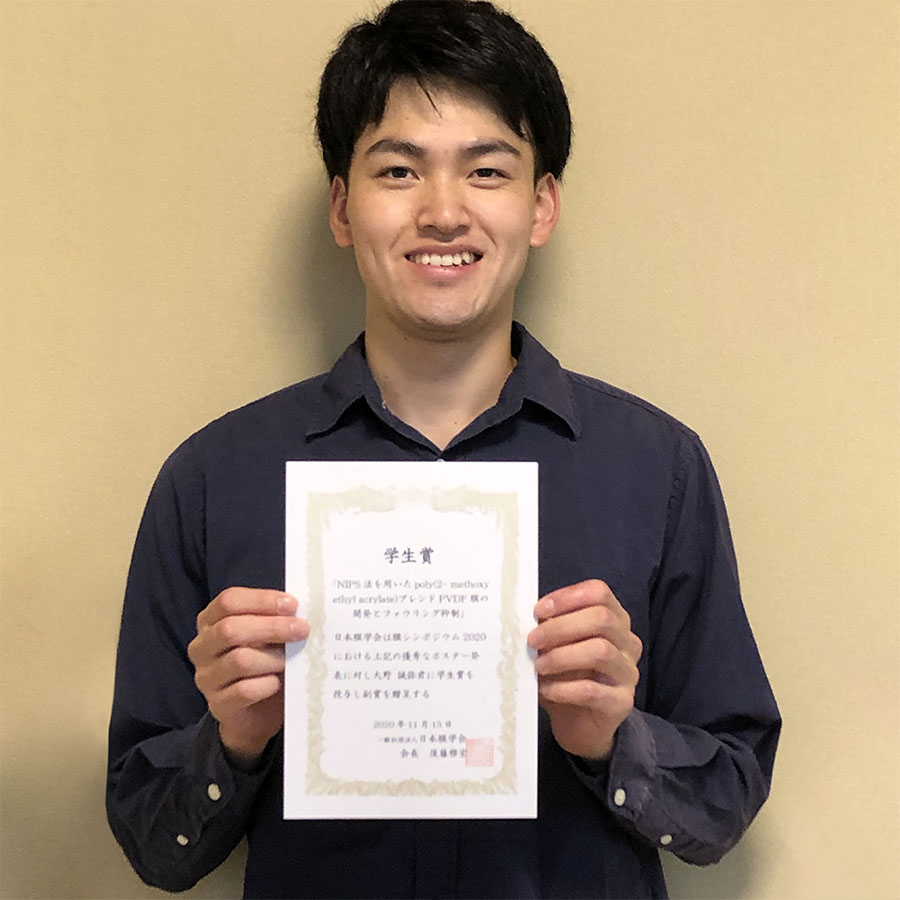 この度は膜シンポジウム2020において学生賞をいただき、大変嬉しく光栄に思います。今回の学生賞は、自分ひとりの力で得たものではなく、中尾先生、赤松先生、王先生をはじめ多くの方々のご協力をいただいてできた成果だと考えています。この場をお借りして、心よりお礼申し上げます。今回の受賞を励みに、今後もより一層研究に邁進していきます。