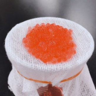 人工いくらは、アルギン酸ナトリウムの水溶液を塩化カルシウム水溶液中に滴下することで、まるでいくらのような小さな丸い粒ができあがる実験です。新メンバーも加入したため、人工いくらの実験と万華鏡制作は、今までの演目のおさらいとして行いました。