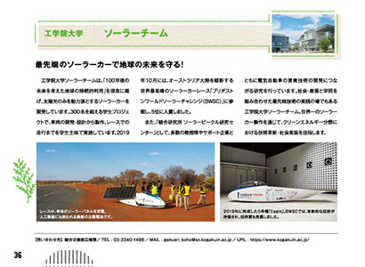この他にも、「エコな大学」特集では工学院大学ソーラーチームの活動・成果が取り上げられ、「キャンパスインフォメーション」では学生プロジェクトやエリア防災+新宿の活動を例に挙げ、本学の実践教育について紹介されています。