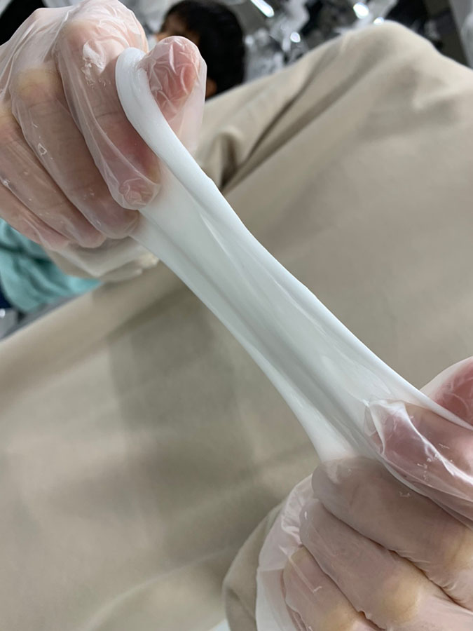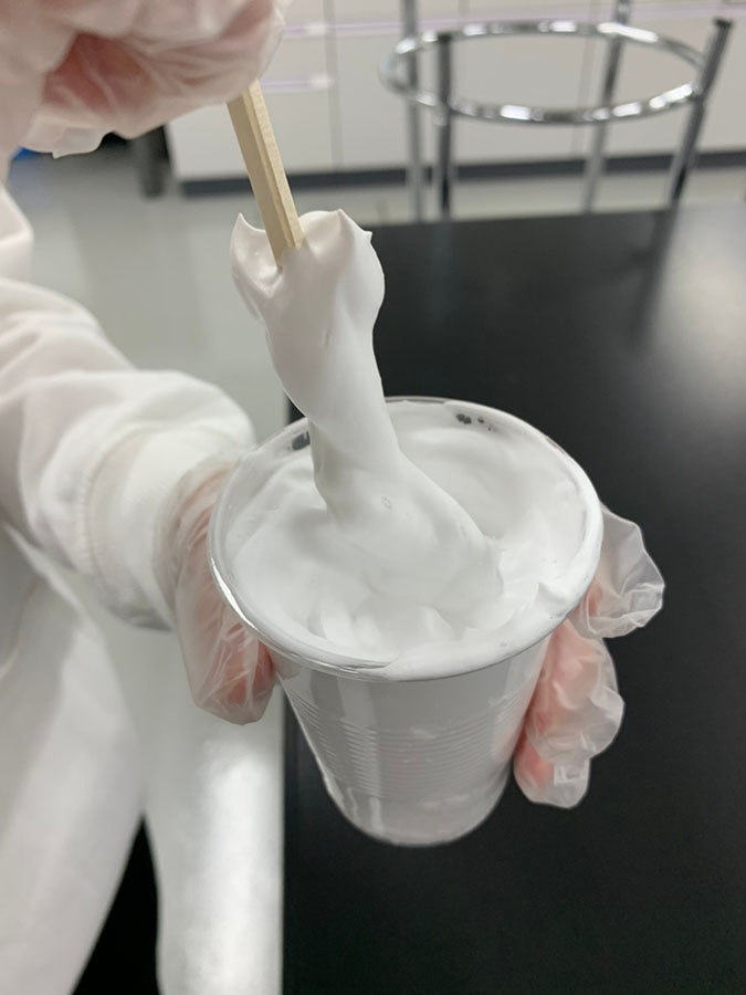 アイスバーグの意味は氷山。普通のスライムとは違い、表面が膜のようになっていて、それを破るときにバリバリと音がなるスライムです。このスライムを作るには、何日かおいておく必要があるため、試作品を作り次の週に結果を見て、材料や配合を見直す活動を繰り返してきました。5回の試作品制作を通して、材料の黄金比や上手く作るコツを見つけ出しました。イベントなどの場で、子どもたちと一緒に実験するのが楽しみです。