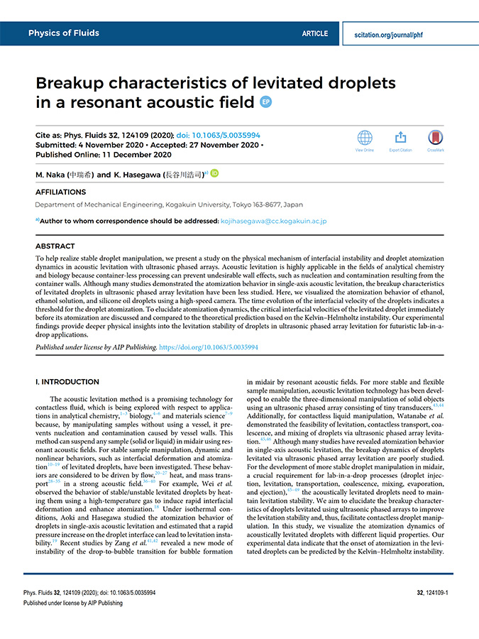 中 瑞希さん(機械工学専攻:指導教員 長谷川浩司准教授)が筆頭著者の研究成果が、国際学術雑誌Physics of Fluidsに公開されました。