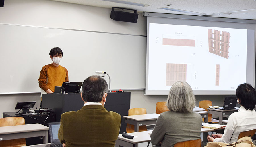 2020年秋頃から、Wa-k.proのメンバーが班ごとに分かれて、コンセプトに合うアイディアを企画。11月末には電通テック、豊栄産業の方々の前で、各班がプレゼンテーションを行いました。バック型持ち運び作業台、周りを気にせず在宅ワークに打ち込めるパーテーション、座りっぱなしを回避して自分にちょうど合う高さが選べるスタンディングデスクなど、様々な案が出そろいました。ダンボールでできたミニチュアの模型を使って発表した班もあり、学生たち斬新な発想に思わず感嘆の声が上がることがありました。それぞれのアイディアについて専門家の視点からアドバイスをいただき、活発な意見交換がされました。