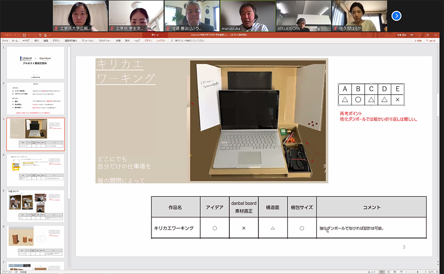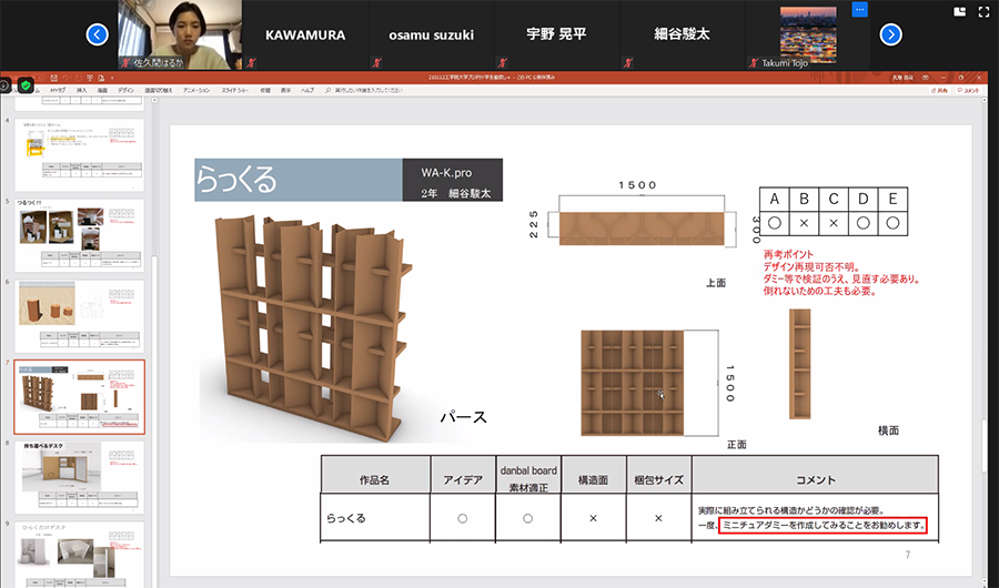 1月13日には、いよいよ開発に向けてのオンラインミーティングが行われました。企業の方々に、コンセプトと合っているか、ビジネス視点で大量生産可能か、素材として強化段ボールが適しているかなど、様々な観点からフィードバックをしていただきました。それを受け、制作に向けて大まかな方向性や今後の流れが決定しました。