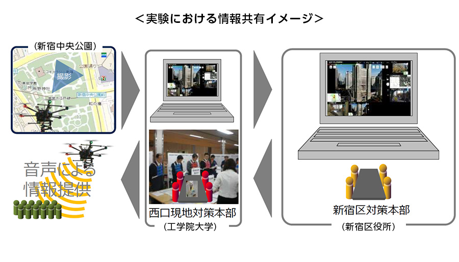 新宿駅周辺地域の被害状況把握および滞留者誘導、新宿区災害対策本部との情報共有を目的に、新宿中央公園でドローンを飛行させ、得られた情報を工学院大学に設置されている新宿駅周辺防災対策協議会の西口現地本部および新宿区役所で情報共有します。今回は、新宿駅周辺防災対策協議会が実施する現地本部運営訓練が同じタイミングで開催され、情報共有を検証する予定です。