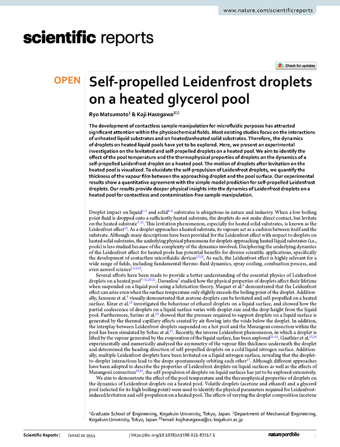 Home 2020年度のお知らせ 機械工学専攻 松本涼さんの筆頭論文がScientific Reportsに掲載 機械工学専攻 松本涼さんの筆頭論文がScientific Reportsに掲載 2021/03/02 シェアする 機械工学専攻修士2年の松本涼さん(混相流工学研究室・長谷川浩司准教授)が筆頭著者の研究成果が、国際学術雑誌Scientific Reportsに公開されました。 英文論文タイトル: Self-propelled Leidenfrost droplets on a heated glycerol pool 日本語論文タイトル: 加熱したグリセリンプール上で自己推進するライデンフロスト液滴 機械工学専攻 前へ 一覧に戻る 次へ
