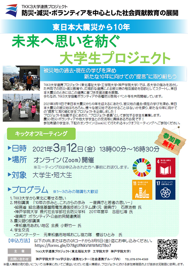 工学院大学は、2011年から、神戸学院大学・東北福祉大学と共にボランティア活動を続けています。2011年の東日本大震災直後には、津波に浸かった写真を復元する「あなたの思い出まもり隊」活動を3大学で実施したり、本学の授業「減災学入門」を両大学の学生も受講して所属大学の単位に振り替える、本学学生が仙台で開かれる防災技術を競う大会に参加するなど、様々な被災地支援活動と防災啓発活動を行ってきました。