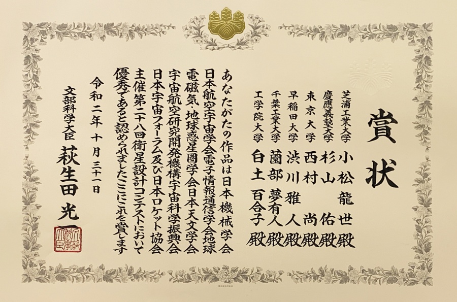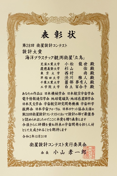 2020年10月31日(土)に開催された第28回衛星設計コンテストの最終審査会にて、先進工学部機械理工学科2年の白土 百合子さんが所属するチームが設計した海洋プラスチック観測衛星「立鳥(たつとり)」が、文部科学大臣賞と設計大賞を受賞しました。
