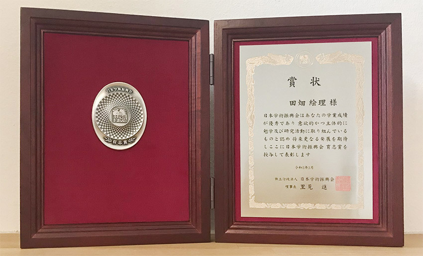 化学応用学専攻博士後期課程3年の田畑絵理さん(生命化学科・生物医化学研究室・小山文隆教授)が、第11回(令和2(2020)年度)日本学術振興会 育志賞を受賞しました。