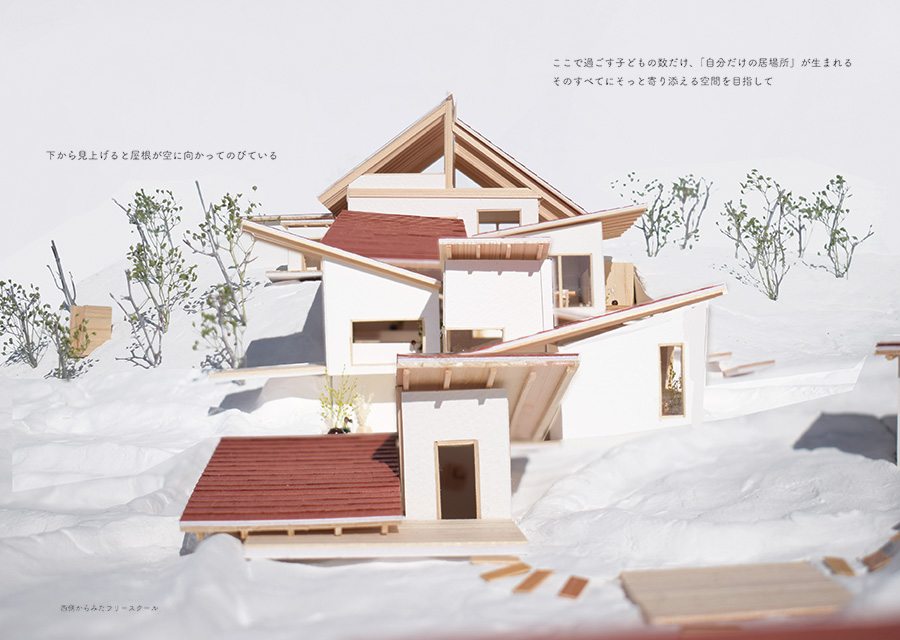 この度は「卒、21」において最優秀賞を頂き、誠にありがとうございました。様々なストーリーの素晴らしい作品が並ぶ中で「不登校」という一見地味にも捉えられるテーマでの自身の作品を丁寧な設計と評価して頂けたこと、とても自信になりました。また講評の中では「卒業設計はこれで終わりではなく、今後設計に取り組んでいく上でのテーマである」というお言葉を頂きました。そのお言葉通り今後も卒業設計を自身の設計の根本として建築に向かっていきたいと考えています。