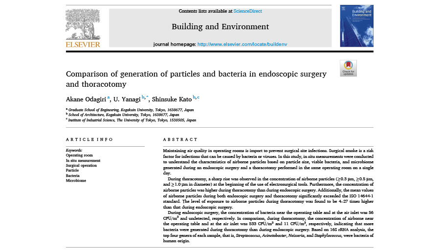 建築学専攻修士2年(論文発表時)の小田切茜さん(柳宇研究室・柳宇教授)の論文「Akane Odagiri, U Yanagi, Sinsuke Kato, Comparison of Generation of Particles and Bacteria in Endoscopic Surgery and Thoracotomy. Building and Environment, Volume 193, 15 April, 2021.」が「Building and Environment」に掲載されました。