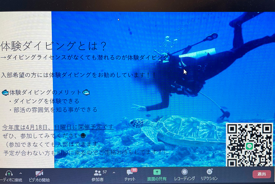 5日のオンライン新入生歓迎会はZOOM上で実施され、委員会・部活動・学生プロジェクト活動の説明をそれぞれの先輩学生が、パワーポイントや動画、部活動の実演を交えて行いました。参加した新入生からは、活動内容や大学生活全般に関わる質問をしていた様子が見受けられました。また、オンライン新入生歓迎会の参加者は延べ2,415名となりました。