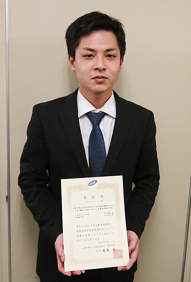 2021年3月にオンラインで開催された公益社団法人自動車技術会 関東支部 2020年度 学術研究講演会 (ICATYE)において、大学院機械工学専攻修士2年の秋元優佑さん(自動車音響振動研究室・山本崇史教授)が「均質化法による多孔質セラミック材の微視構造モデリングおよび微粒子捕集フィルターの音響透過損失予測」と題する研究発表でベストペーパー賞を受賞しました。