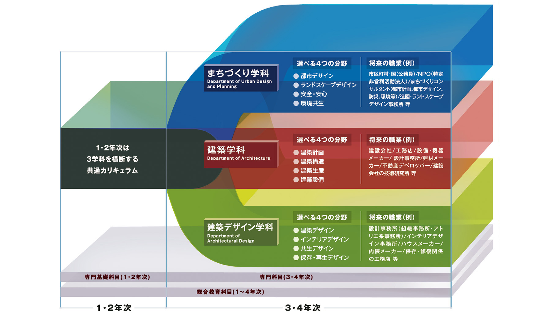 1・2年次は専門に偏ることなく、共通カリキュラムで建築学の基礎や一般教養を幅広く学びます。3・4年次には学科ごとに分かれ、いずれかの分野に軸足を置きながら、関連する他学科・他分野の科目も合わせて履修して、興味のある領域をより深く学んでいくことができます。