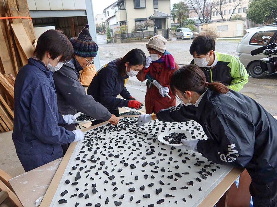 天井材の炭の張り付け