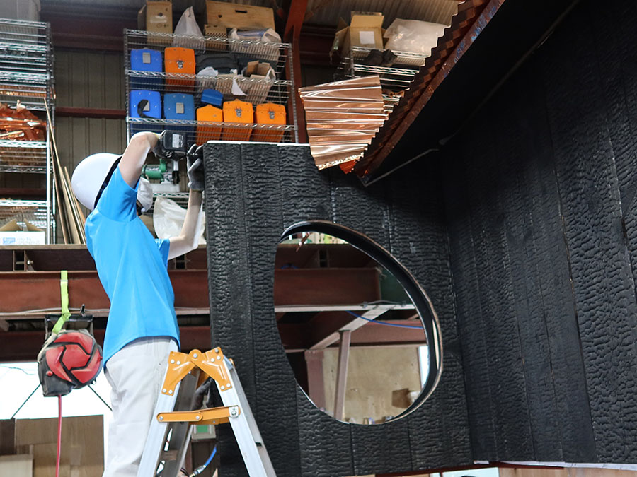 焼杉を張り付ける作業では、墨出しとカットを何度も繰り返し行い、まるで巨大な模型作りをしているようでした。作業を通して、予定通りに進める難しさを実感しました。今後も実体験を積むことで、現場で臨機応変に対応するための柔軟性と発想力を身に着けていきたいです。