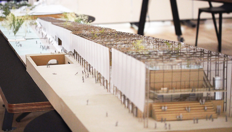 また、学部4年生の課題「江戸-東京パフォーミング・アーツセンター」では、細長い敷地を活かした建築の提案が、見ごたえのある模型とともに発表されました。力強くシンボリックであると同時に、敷地と建築、建築と人との関係が丁寧に考えられた意欲作でした。