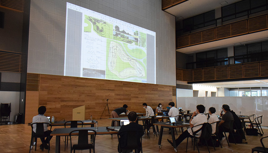 建築学部が、昨年度後期・今年度前期の設計課題の優秀作品を全学年一堂に集めて発表・講評するバーティカルレビューを8月2日に開催しました。今年は新宿キャンパスのアトリウムを会場とし、多くの学生や教授たちがオンラインで参加しました。学部1年生から修士1年生まで15名の学生たちが登壇しました。