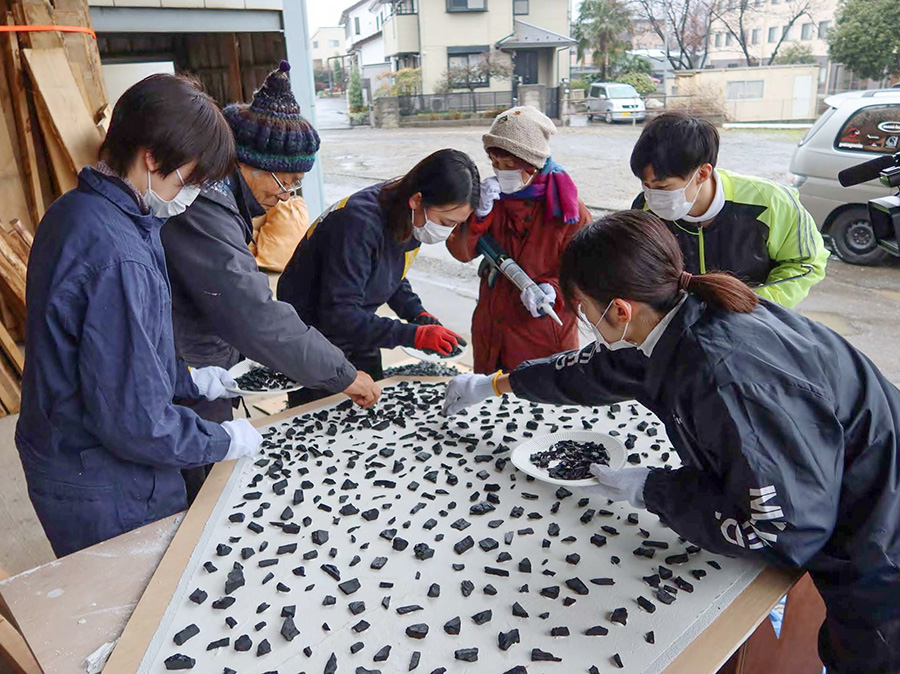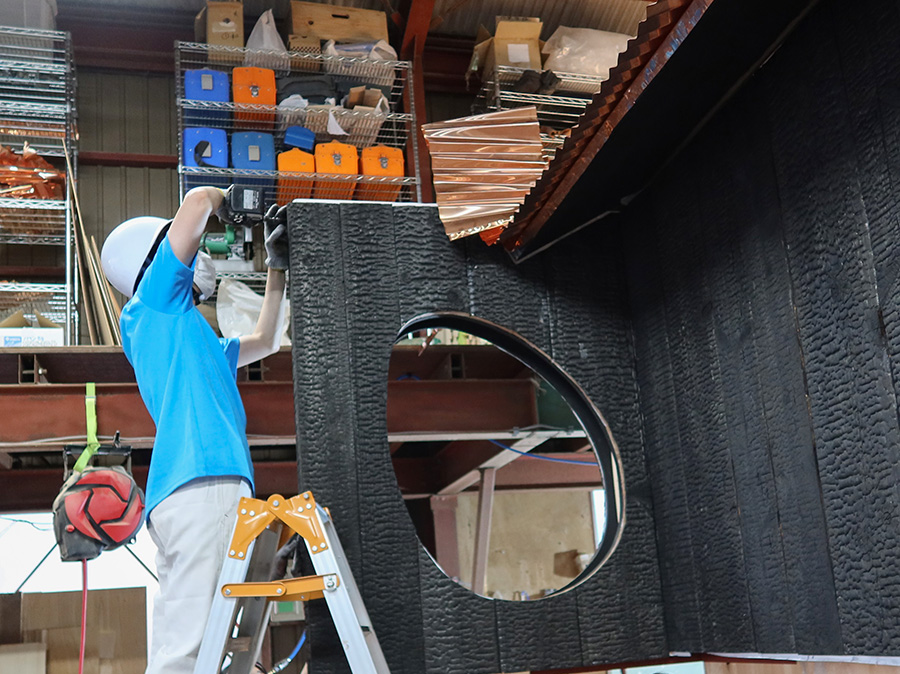 茶室の制作には、工学院大学大内田研究室(建築デザイン学科、指導教員:大内田 史郎教授)の学生たちが協力しました。2020年3月に、埼玉県にある工房で茶室内部の天井材の漆喰塗りや、天井に無数に張り付けられた炭の加工・張り付け作業を行いました。その後、東京2020大会の延期が発表されたことを受けて開催時期が変更となり制作を一時中断しましたが、2021年の5月に同じ工房で2階部分の外壁に使用された焼杉の加工・取り付けを行いました。