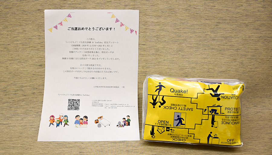 自治会常任委員会主催の元、防災・減災・ボランティアを中心に社会貢献を目指して連携しているTKK3大学による、「いつでもどこでもできる防災訓練」オンラインを視聴した学内関係者に対し、防災で必要と感じるものや防災全般に関するアンケート結果をもとに、村上正浩教授と村上研究室の学生にアドバイスをもらいながら、「防災ポーチ2021」が完成しました。